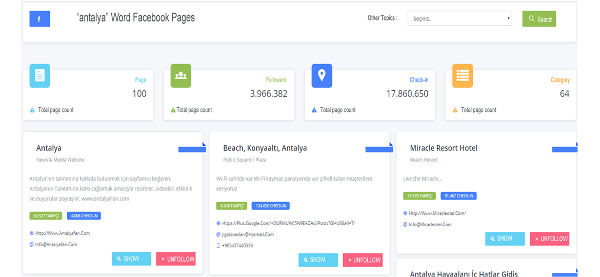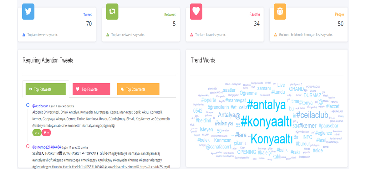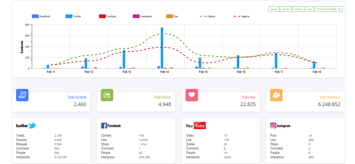Likoid Social Social Media Analysis is a system that shows who shared what is shared instantly with keywords or regional scanned content shared on social media. On this system, statistical information such as emotion intensity, interaction statistics, number of speaking singular persons are given.